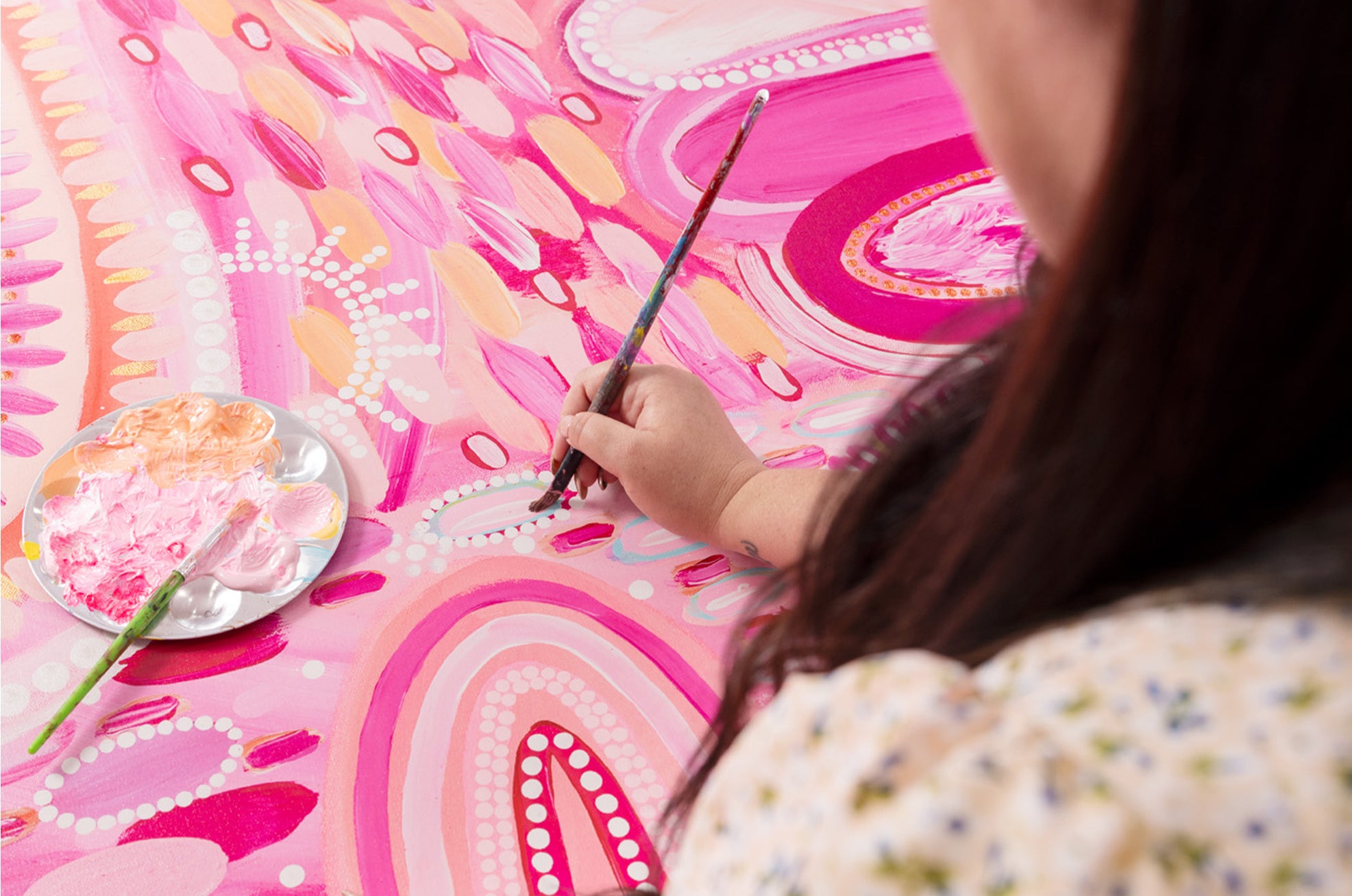 Hailing from the ancestral heritage of the Wemba Wemba, Wiradjuri, Wotjiboluk, Nari Nari, and Boon Wurrang people, Kenita-Lee’s captivating artwork depicts strong feminine matriarchs and the strength and guidance of women that came before her.