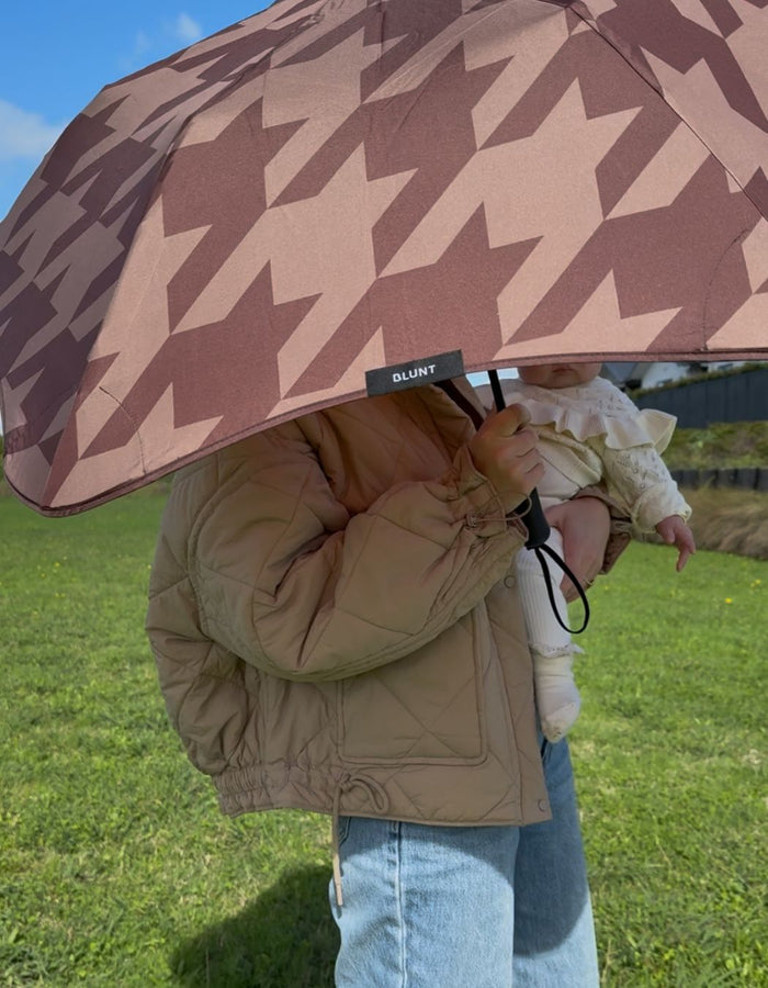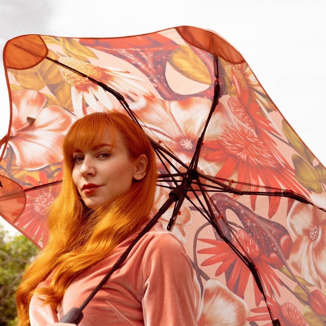 This collaboration marks Kelly Thompson’s second venture with BLUNT. A masterpiece that seamlessly blends earthy hues with delicate florals. As raindrops delicately dance across the canopy, this design beckons you to embrace the season in style.
