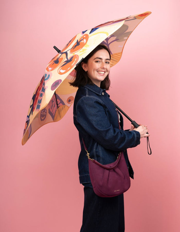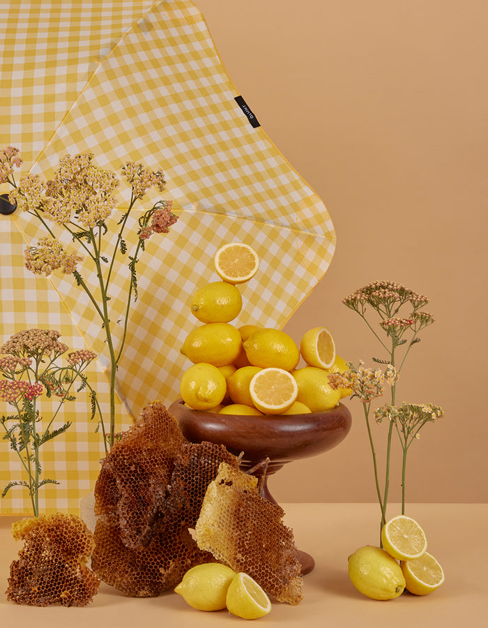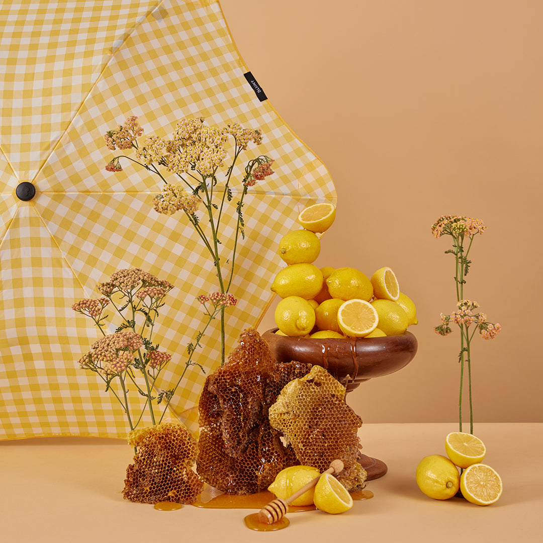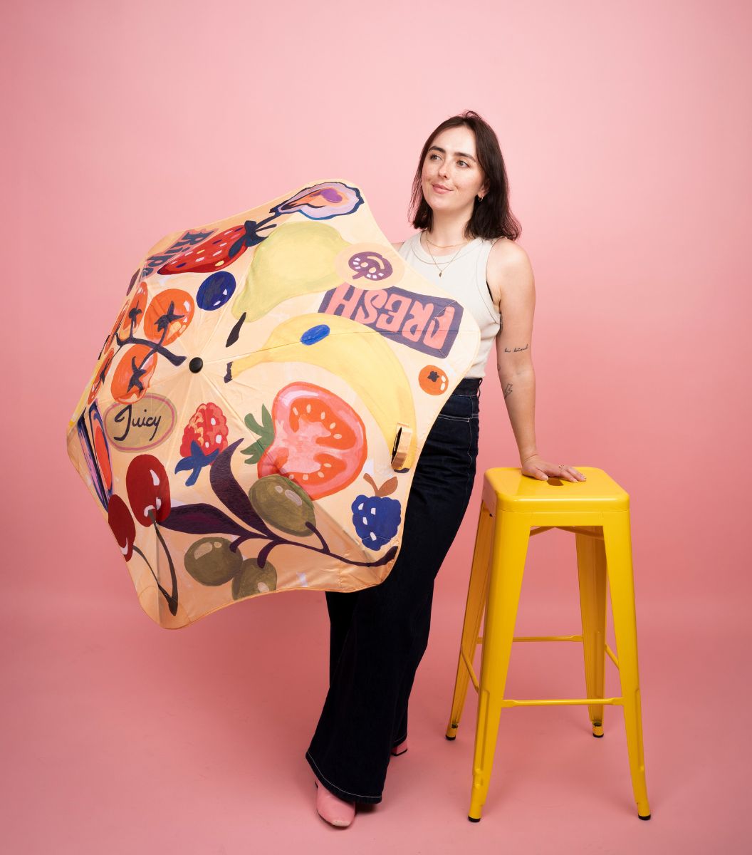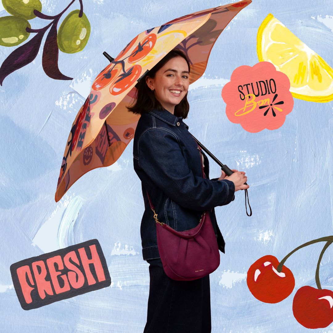 Artist Bonnie Brown, the creative force behind Studio Bon, brings her signature bold colour and playful charm to our latest limited edition BLUNT Umbrella. It’s a little bit cheeky, think ‘5+ a day’ meets childhood nostalgia, like stealing lemons from a neighbour’s tree or trusting an honesty box on a country road.